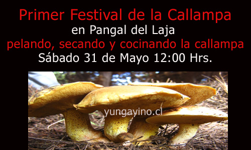 Yungay, la Junta de Vecinos de Pangal del Laja invita a toda la comunidad para este sábado 31 de mayo a partir de las 12:00 horas en el salón Multiuso al Primer Festival de la Callampa, donde se realizarán presentaciones de degustaciones de los distintos modos de preparar los mejores platos con acompañamientos de callampas de la zona. La actividad que tiene como objetivo de rescatar esta tradicional y silenciosa labor de recolección de callampas que se realiza en los bosques de la zona Pangalina, además que las dueñas de casas puedan preparar una gran tarallinata, donde presentarán degustaciones al público que asista con diferentes variedades de salsas a base callampa. Finalmente la Junta de Vecinos de Pangal del Laja reiteró su invitación para que asistan en familia y así apoyar el recate de esta tradición de Pangal del Laja.