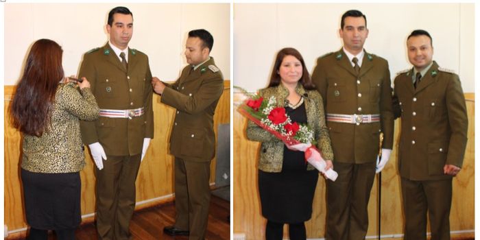 En la ocasión el Carabinero fue investido por parte del Teniente Sr. Juan Marcelo Fredes, quien puso sobre sus hombros los nuevos símbolos junto a la esposa del funcionario ascendido Sra. Pamela Gajardo Lincolao. También el Teniente Sr. Juan Marcelo Fredes hizo entrega de un bouquet de flores a la Sra. Pamela Gajardo Lincolao por la abnegada labor que desarrollada como cónyuge del Sr. José César Riquelme Bravo para poder lograr este nuevo grado.