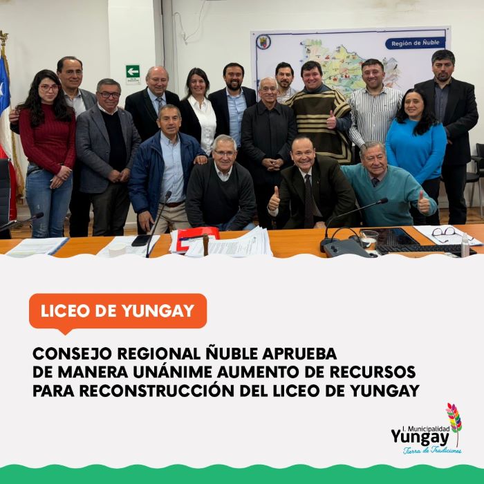 Septiembre 2024: En la sesión 144 del Consejo Regional de Ñuble se aprobó de manera unánime el aumento de recursos para financiar la reposición del Liceo de Yungay.