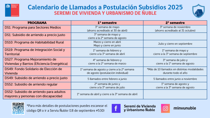 Marzo 2025: El Ministerio de Vivienda y Urbanismo busca garantizar el derecho a una vivienda digna y adecuada, promoviendo soluciones de arriendo, compra y construcción, por lo que todos los años da a conocer el calendario habitacional para acceder a los subsidios, en donde Ñuble tiene un aumento presupuestario, siendo una de las carteras que más invierte en la región con $159.425 millones a disposición.