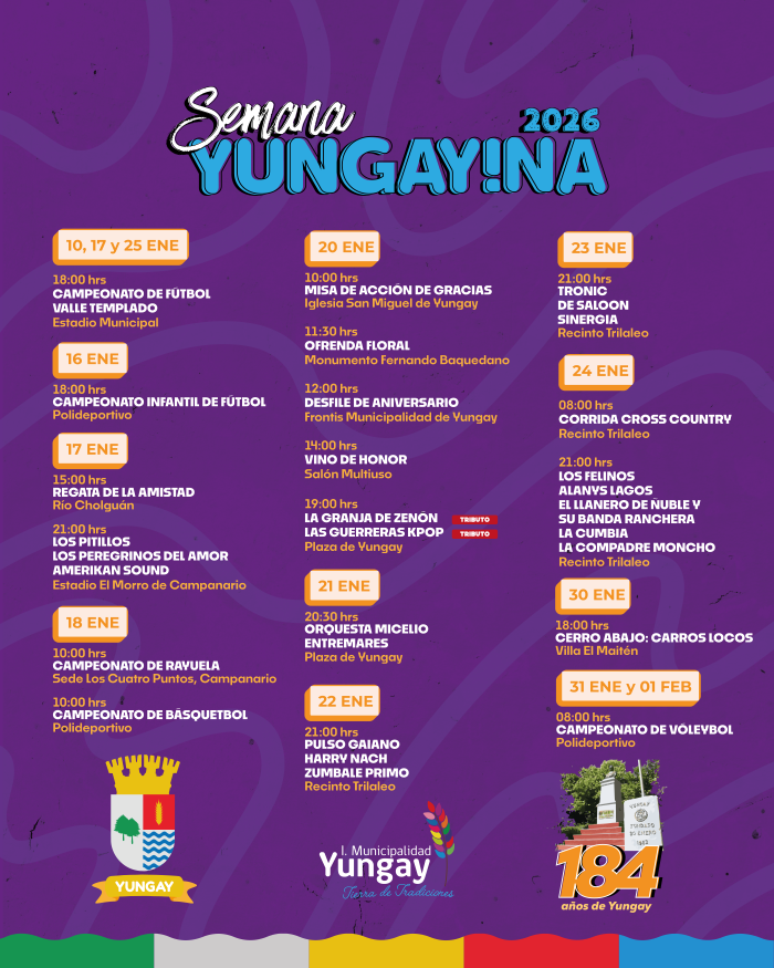 Yungay, enero 2026: Con una nutrida programación cultural, recreativa y deportiva, la comuna de Yungay dio a conocer oficialmente su Calendario de Actividades de Verano 2026, en el marco de la conmemoración de su 184° aniversario, invitando a la comunidad y a visitantes a ser parte de esta tradicional celebración estival.